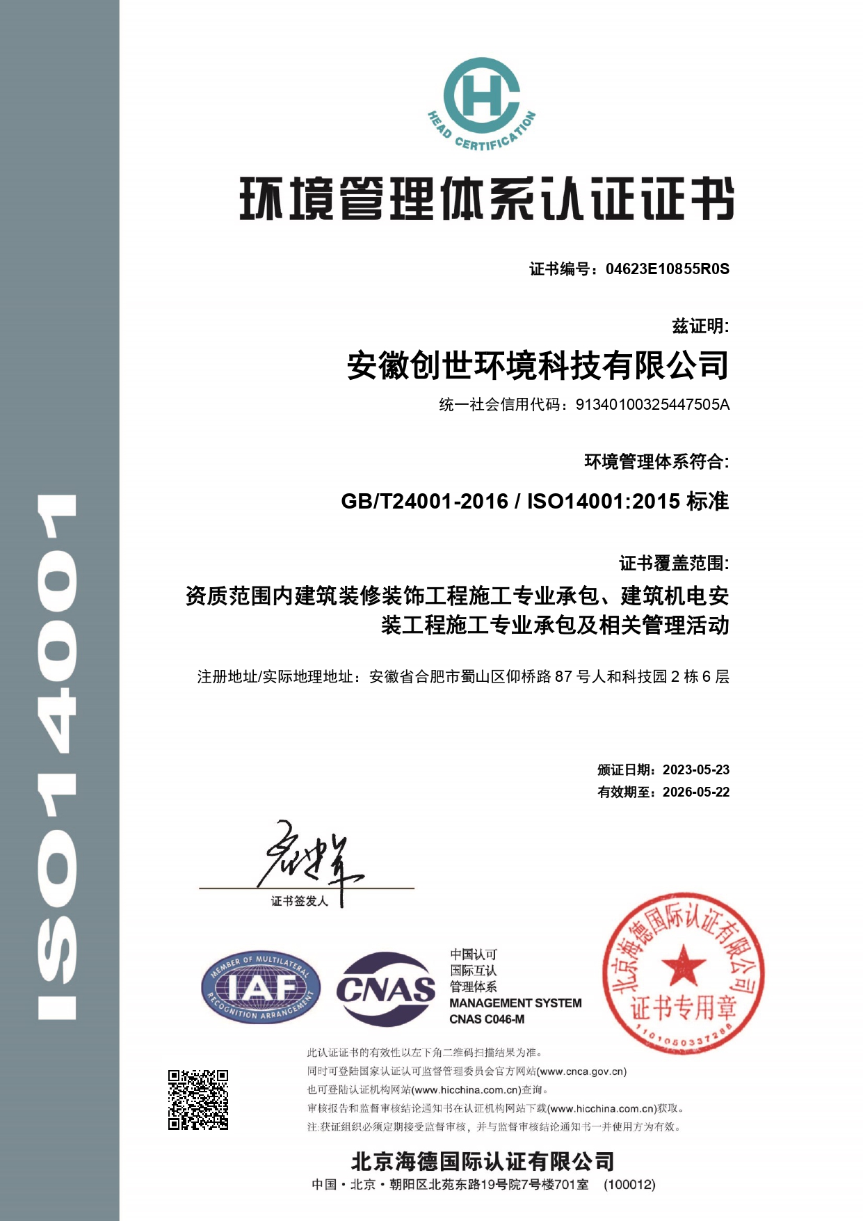 環(huán)境管理體系認證證書