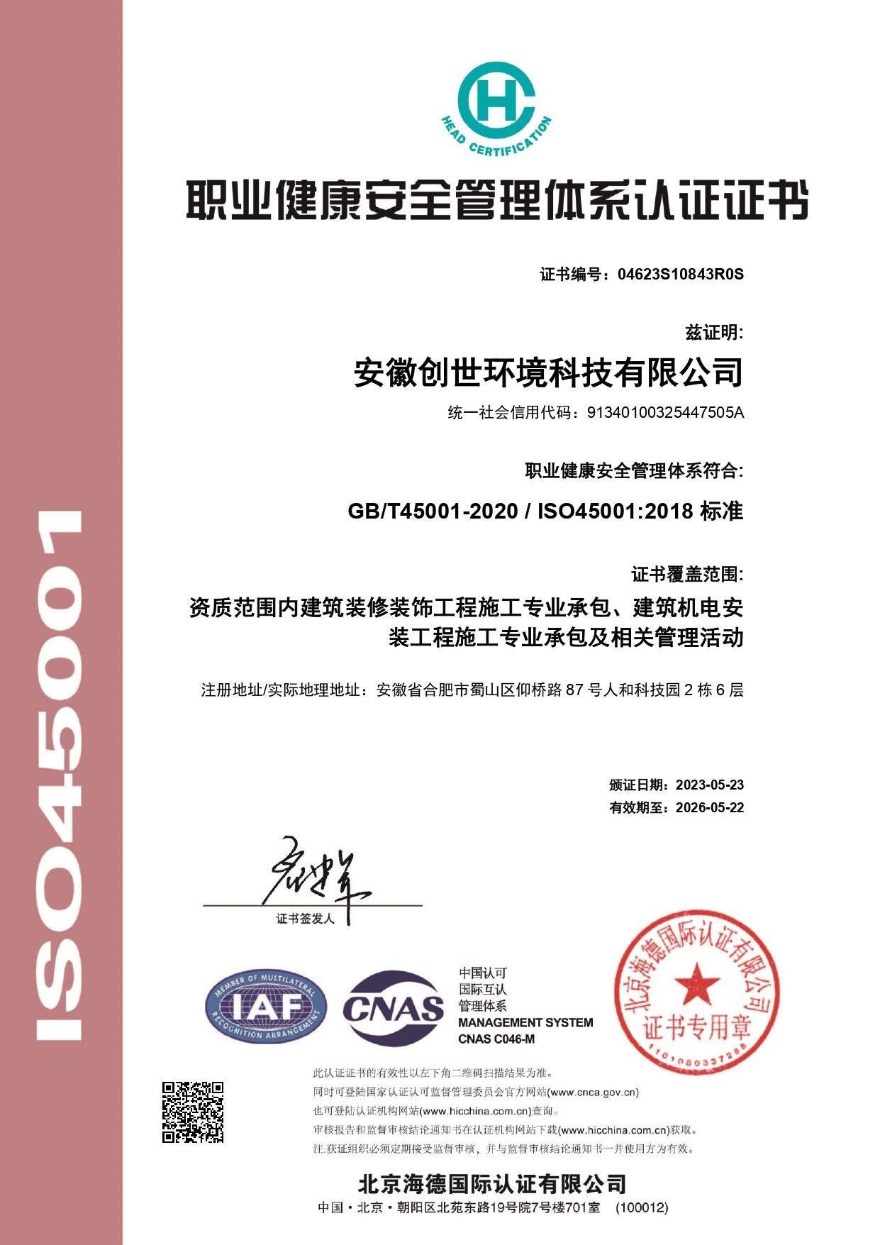 職業(yè)健康安全管理體系認證證書