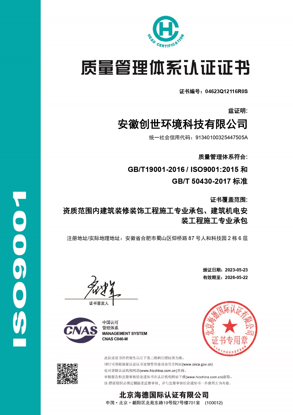質(zhì)量管理體系認證證書