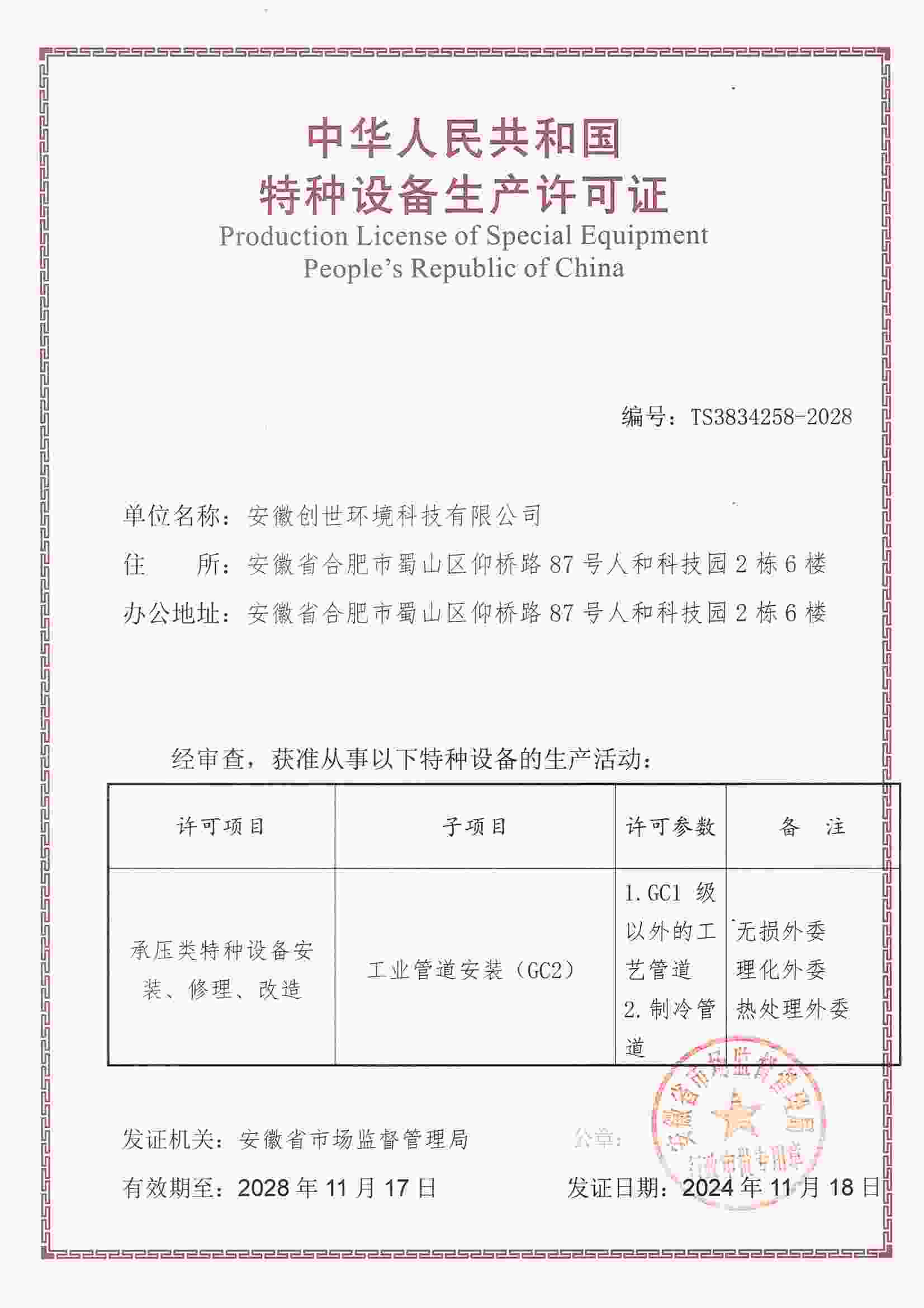 特種設(shè)備生產(chǎn)許可證
