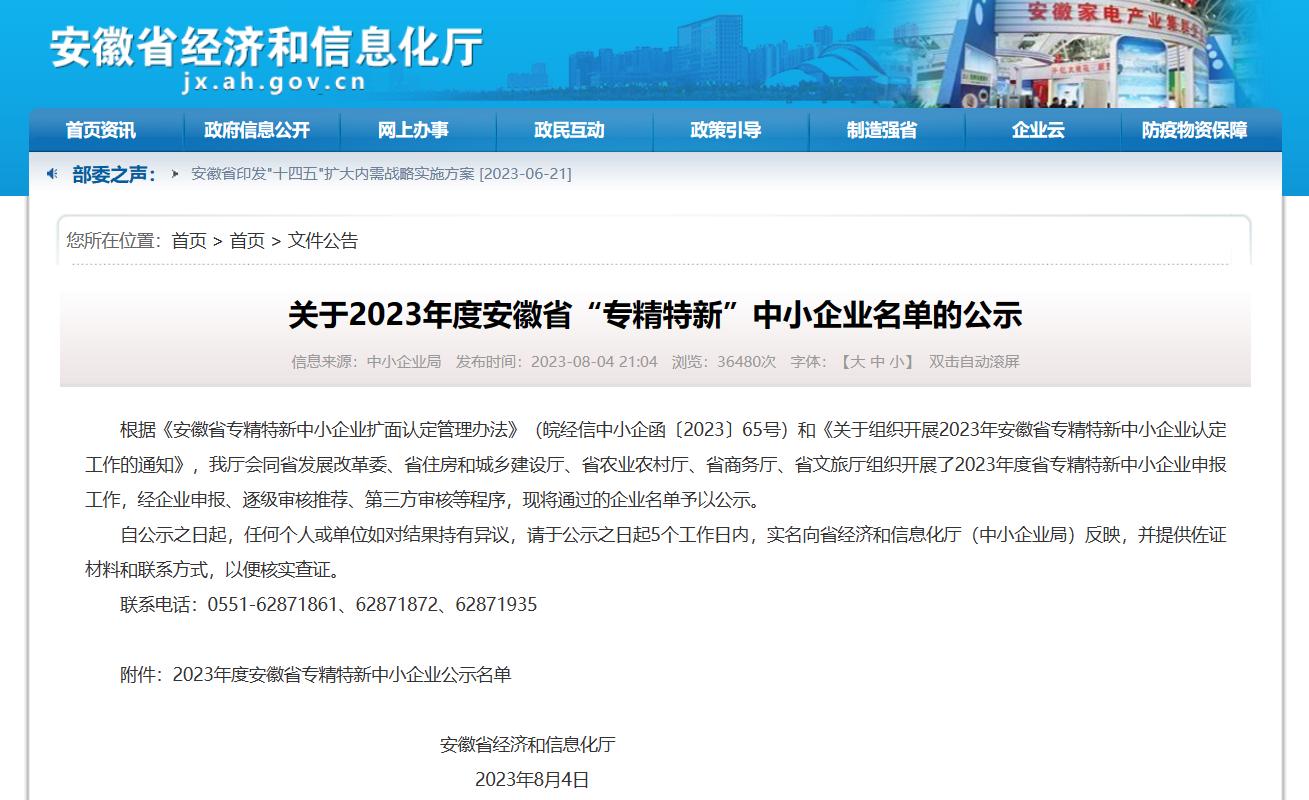 根據(jù)安徽省經(jīng)濟(jì)和信息化廳發(fā)布的《關(guān)于2023年度安徽省“專精特新”中小企業(yè)名單的公示》((皖經(jīng)信中小企函〔2023〕65號)),安徽創(chuàng)世環(huán)境科技有限公司成功入選為2023年度安徽省“專精特新”中小企業(yè)。